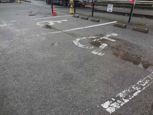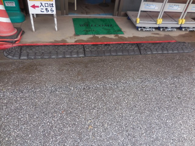 【駐車場から入口まで】駐車場から出入口まで、段差解消のための勾配約8°のスロープあり