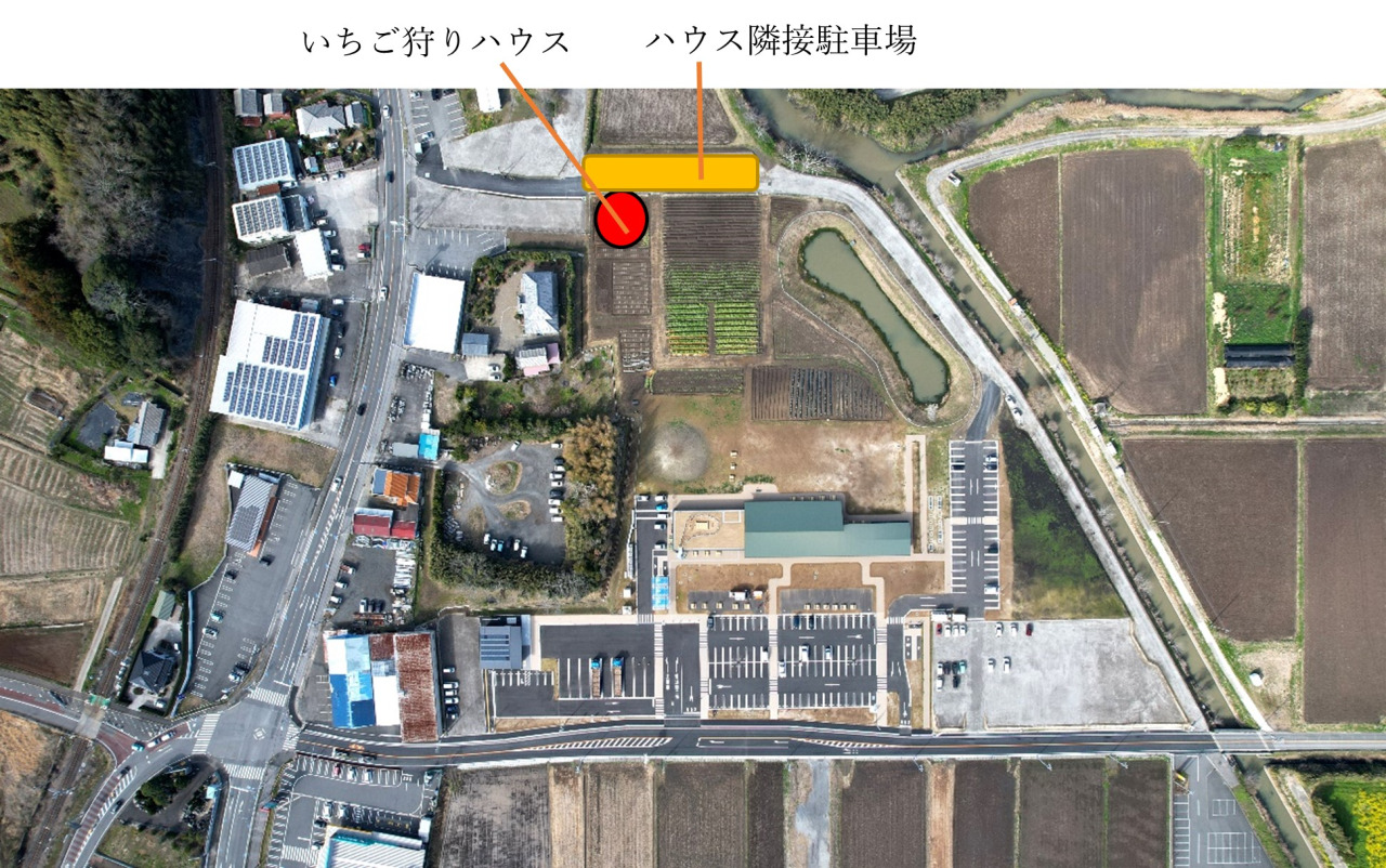 受付後に農園を通っていちご狩りハウスへ向かうか、車でハウス隣接駐車場まで向かってください。