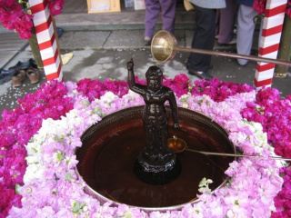 花で飾った花御堂内のお釈迦様像に甘茶をかけて、お祝いの意を込めてお参りします。