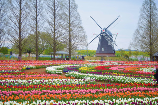 当園では、3月下旬からさくら山(あけぼの山公園)の桜が見頃を迎え、見頃期間には夜桜のライトアップと露天商の出店を予定。4月中旬には風車前花畑に16万球のチューリップが咲き誇ります。