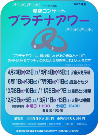 ※4月25日(土)は「ひよこプラネタリウム」、29日(水・祝)は「親子星空ライブコンサート」