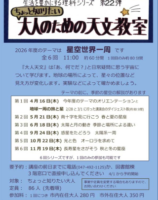 大人向けの天文講座です。今年度のテーマ「ほしぞら世界一周」に沿って、6回シリーズで詳しくお話します。1回のみの参加もできます。参加ご希望の方は、それぞれ前日までに電話でお申し込みください。