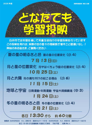 小中学校の理科で習う天文・宇宙分野についての投映です。今回は小学校4年生の「冬の星の明るさと色・冬の星の位置変化」です。小学生はもちろん大人の方もどうぞ。