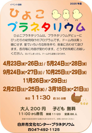●ひよこプラネタリウム(約30分間) 観覧料:大人200円 高校生以下無料