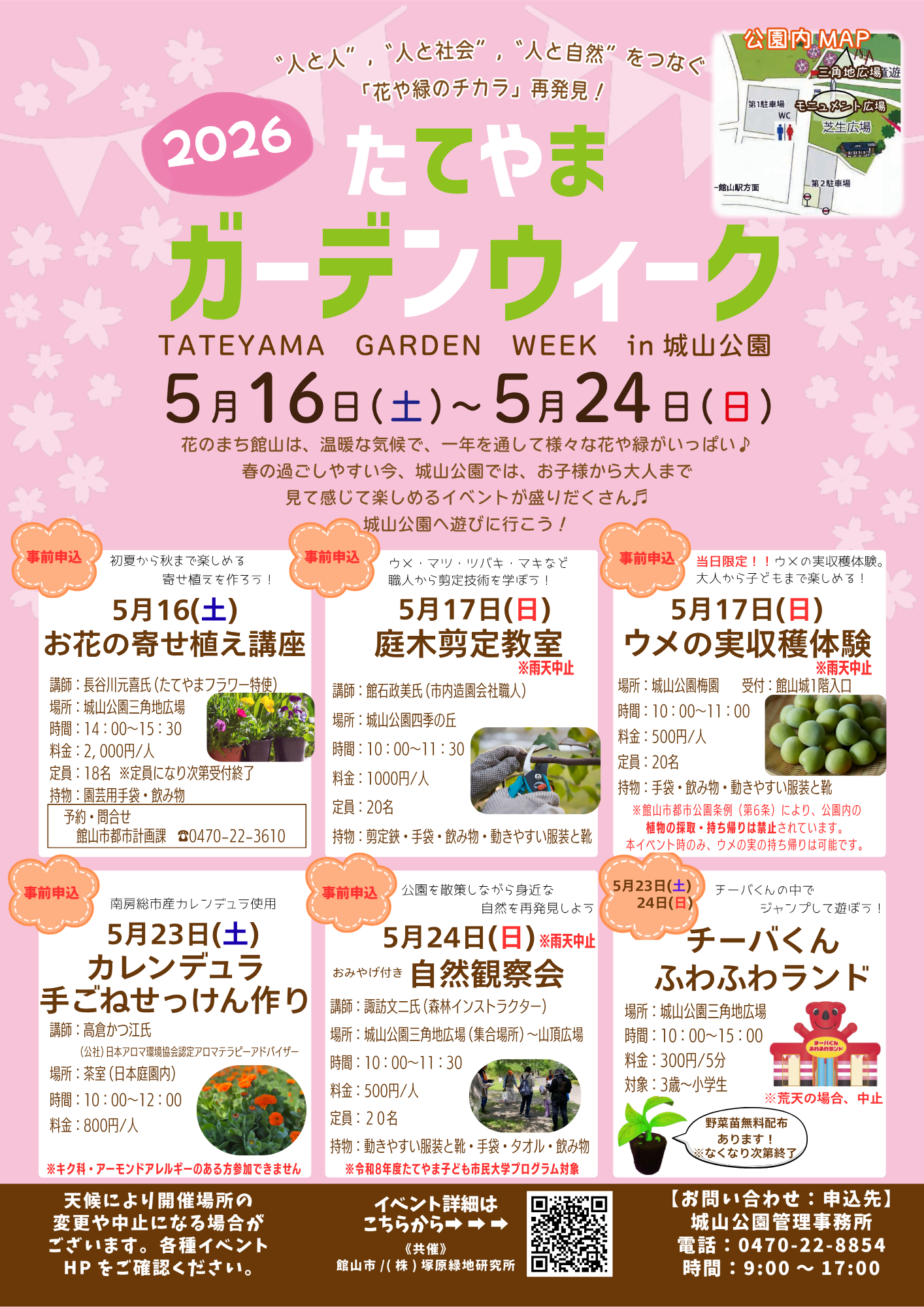 地域の皆さまに親しまれている城山公園で、「人と人」「人と社会」「人と自然」をつなぐ機会として、身近な自然にふれ、花や緑の持つ力や魅力をあらためて感じていただくガーデンウィークを開催します。期間中は様々なガーデンイベントを開催いたします。各世代の方が楽しめる内容となっておりますので、ぜひ城山公園に足をお運びください。