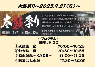 毎年夏に開催される「太鼓祭り」は、九十九里町を拠点とする「和太鼓 風-KAZE-」や、江戸時代から銚子に伝わる祭り太鼓「銚子はね太鼓」などの和太鼓団体が集まり、迫力ある演奏を披露する伝統的なイベントです。力強いリズムが訪れる人々を魅了し、日本の文化を存分に体感できる機会です。
