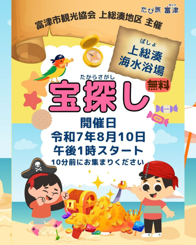 富津市の南側にある、上総湊海水浴で富津市観光協会上総湊地区主催の宝探しイベントが開催されます。参加は無料でどなたでも。小さなお子様も参加できます(大人の方が必ず付き添いでご参加下さい)。みんなでお宝をゲットしよう!