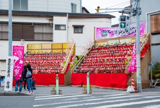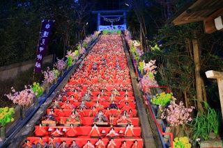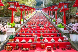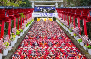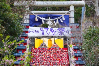 神社の60段もの石段に約1,800体のひな人形が毎朝飾り付けされます。(雨天時はパネルの展示)