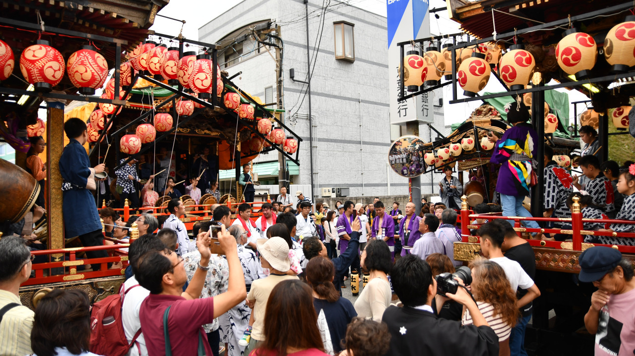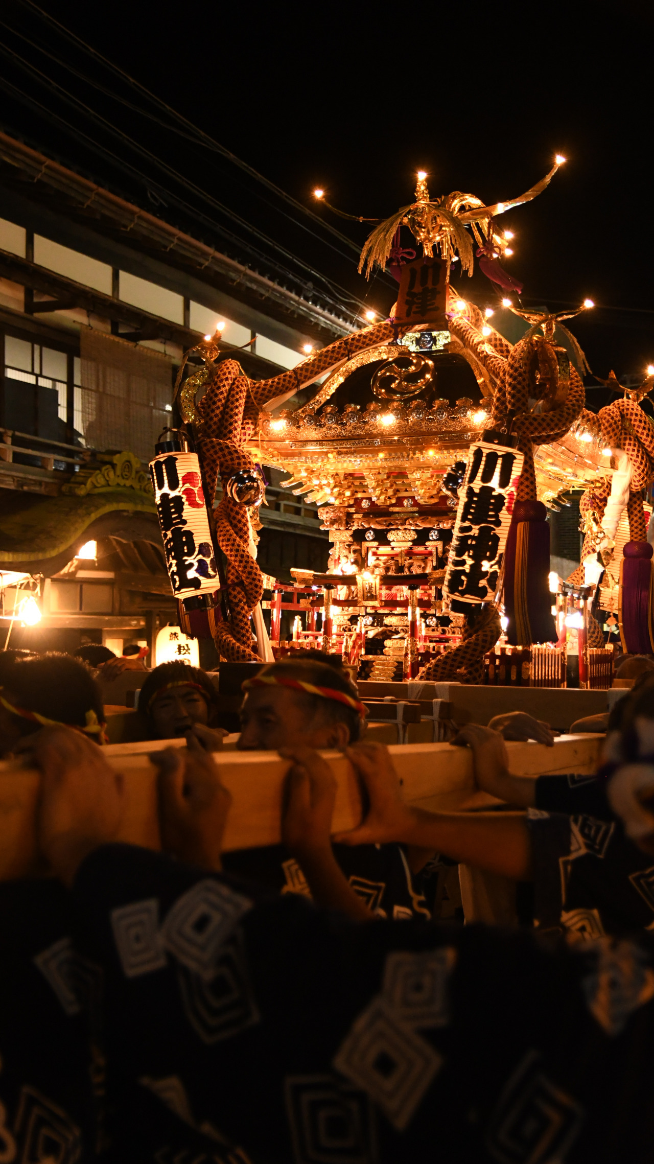 夜は、花火が打ち上げられ、お祭りはクライマックスに!山車の提灯にも灯が入り、あたりは一層、盛り上がりを見せます。地元民だけでなく、観光客も飛び入りで山車を引けるなど、誰もが楽しめるお祭りです。