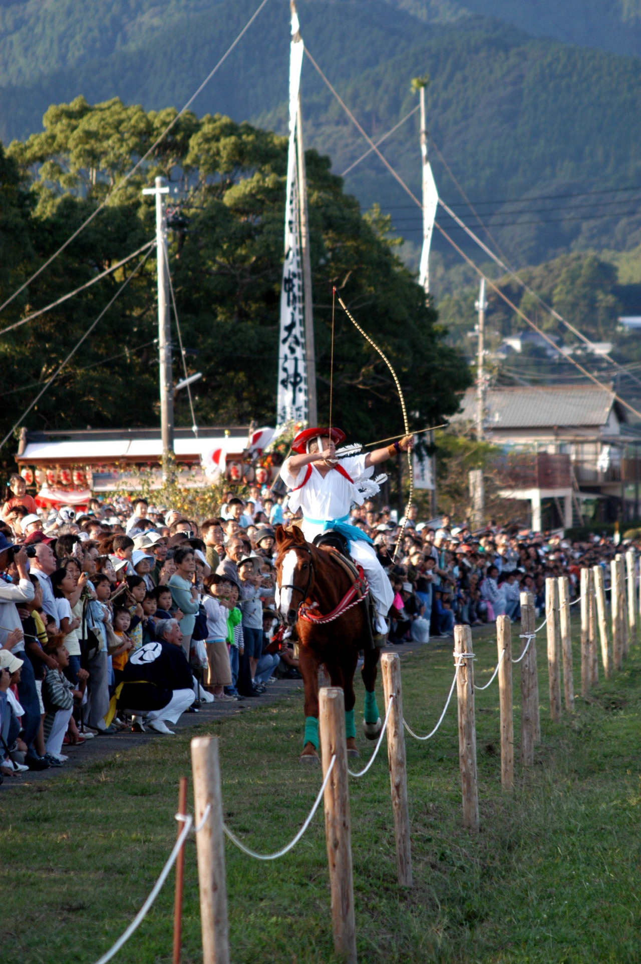 疾走する馬上から的を目がけて矢を放ち、翌年の稲作の豊凶適種を占う吉保八幡神社の祭礼神事で、県の無形民俗文化財に指定されています。