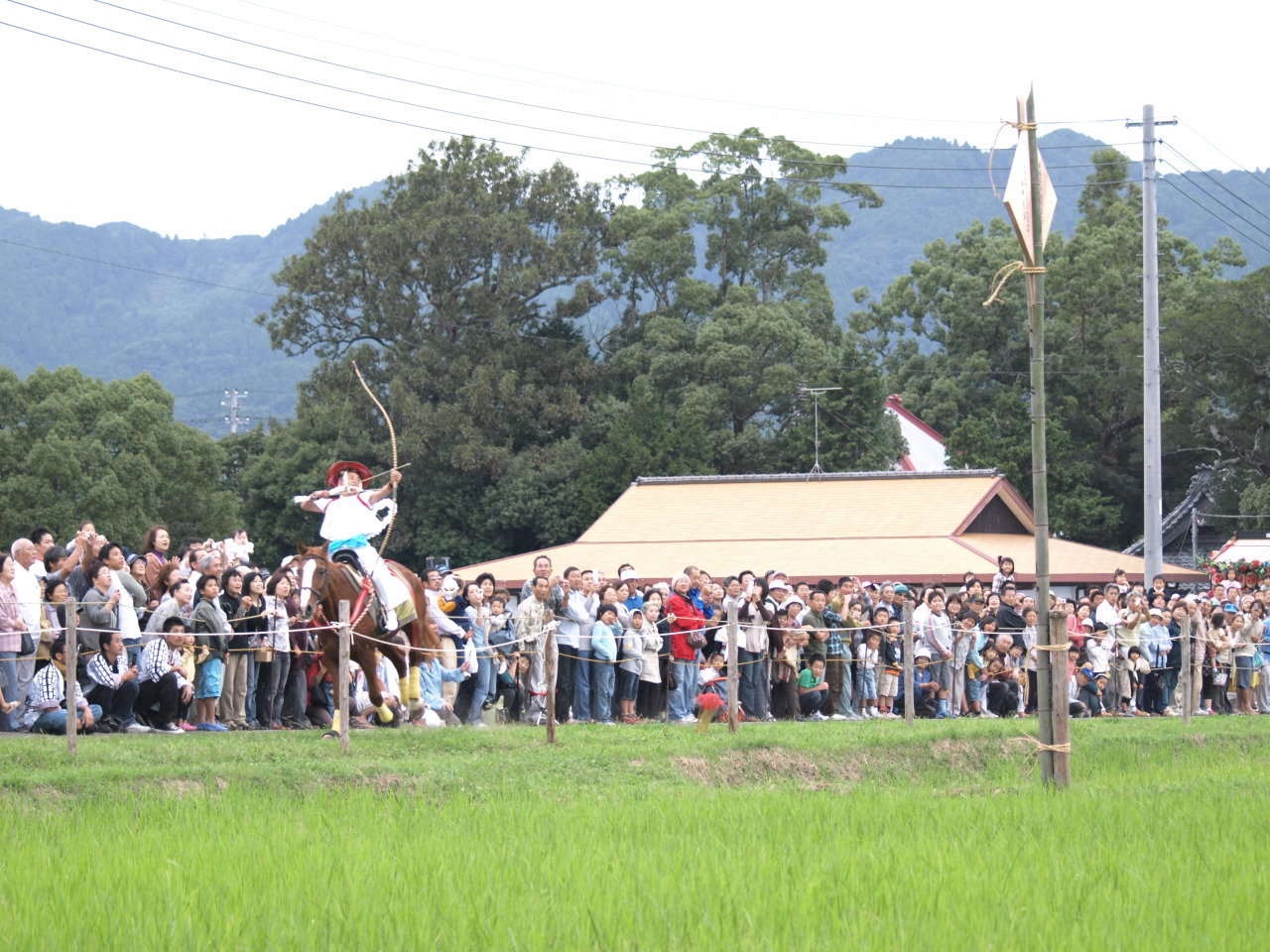 この流鏑馬は、鎌倉時代までさかのぼるとも、安房国の国主・里見家が領民に武芸を広めようとして行われたものが始まりだとも言われています。的は、早稲・中稲・晩稲の稲の品種を意味し、長さ約5mの竹の先に取り付けられた1m四方の板で、直線約200mの馬場に3か所置かれます。「称宣」と呼ばれる射手が合計9本の矢を放ち、その矢の当たり具合から豊作・凶作・適種を占います。