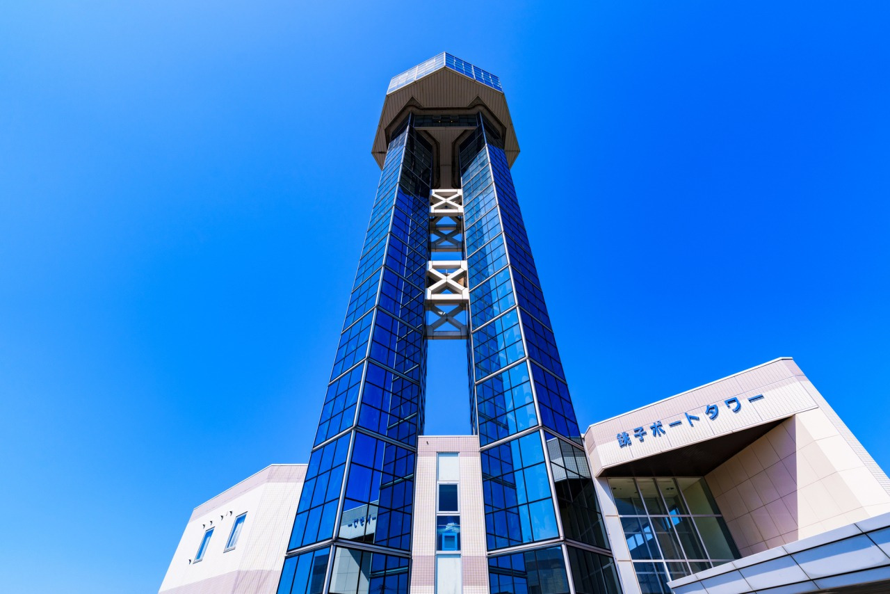 利根川河口にそびえる「銚子ポートタワー」は、全国的にも珍しい総ガラス張りのツインタワー。