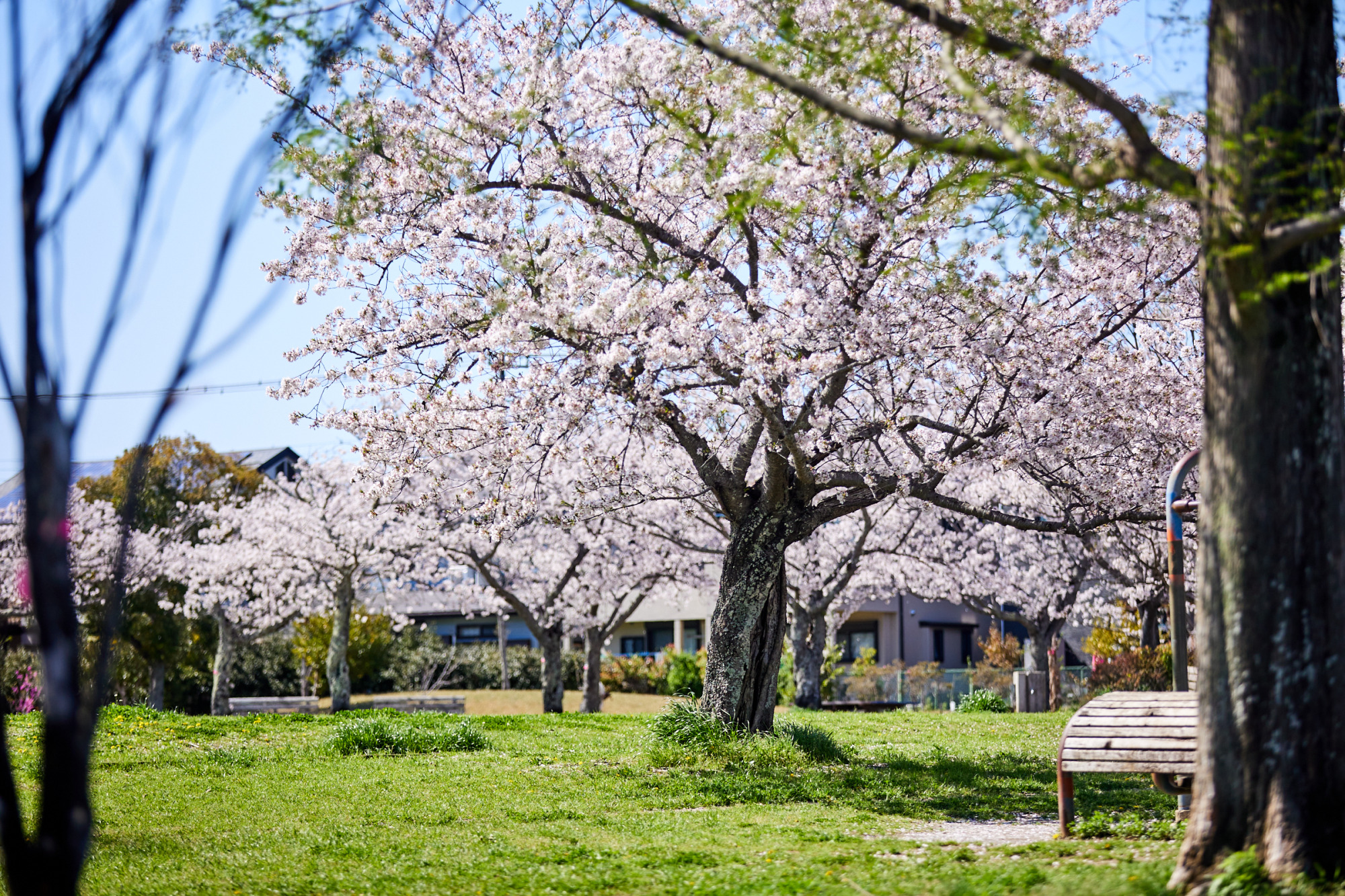 点在する木々の散策路は、季節の移ろいを感じる散策や休憩にぴったりで、桜の時期にはさらなる賑わいを見せます。