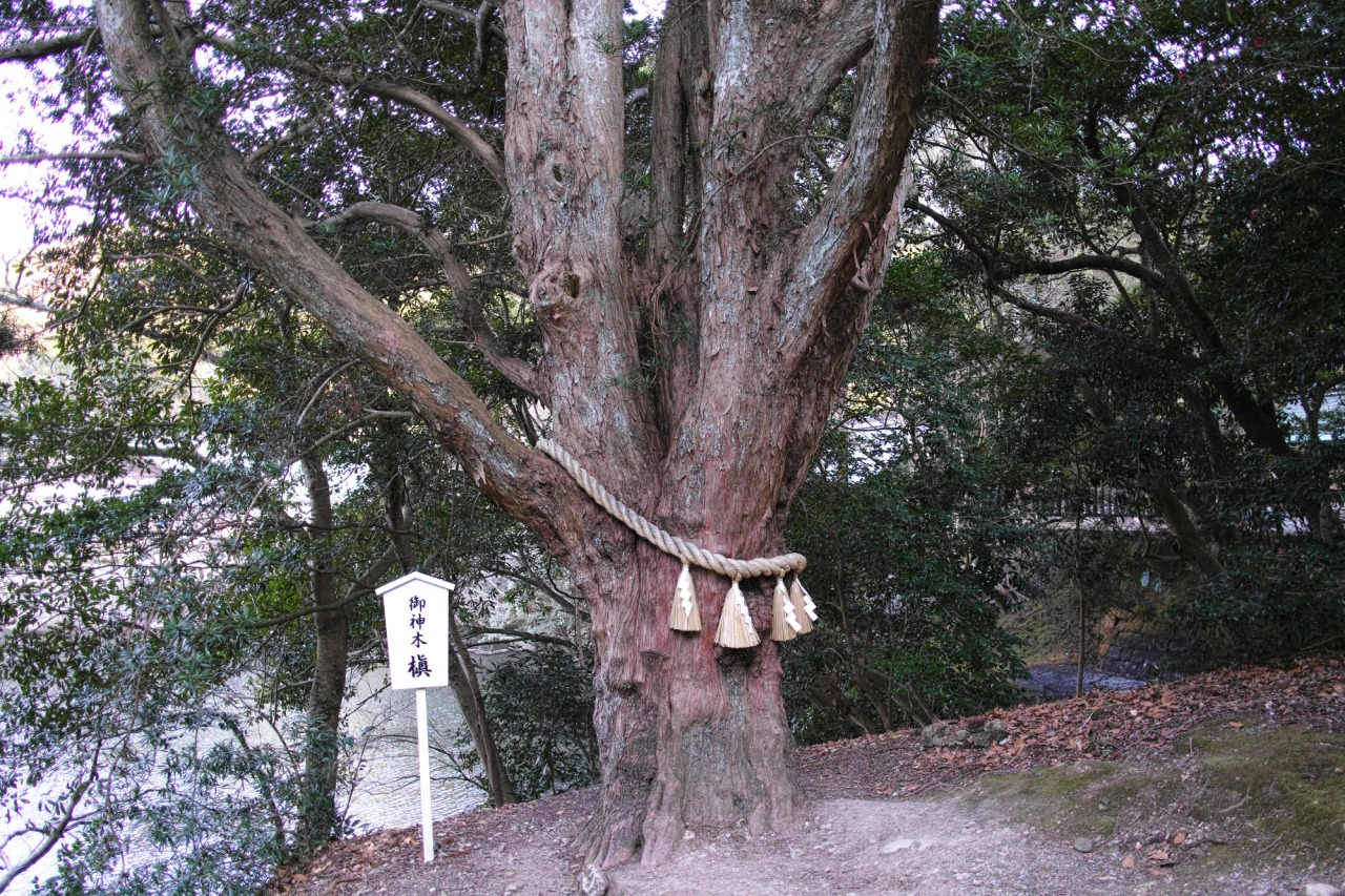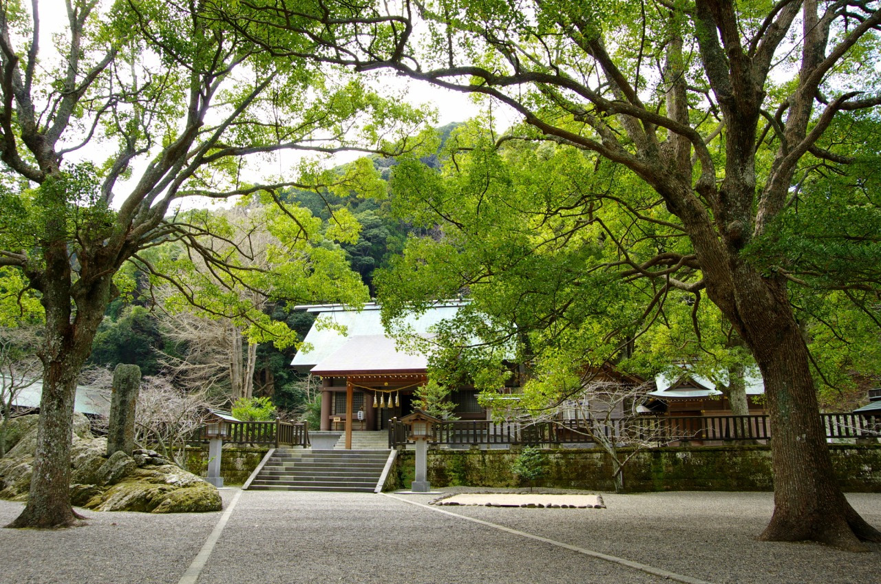 伊勢神宮を彷彿とさせる「神明造り」の本殿は凛とした気品に満ち、境内では樹齢約500年の御神木や神秘的な海食洞窟が見どころです。