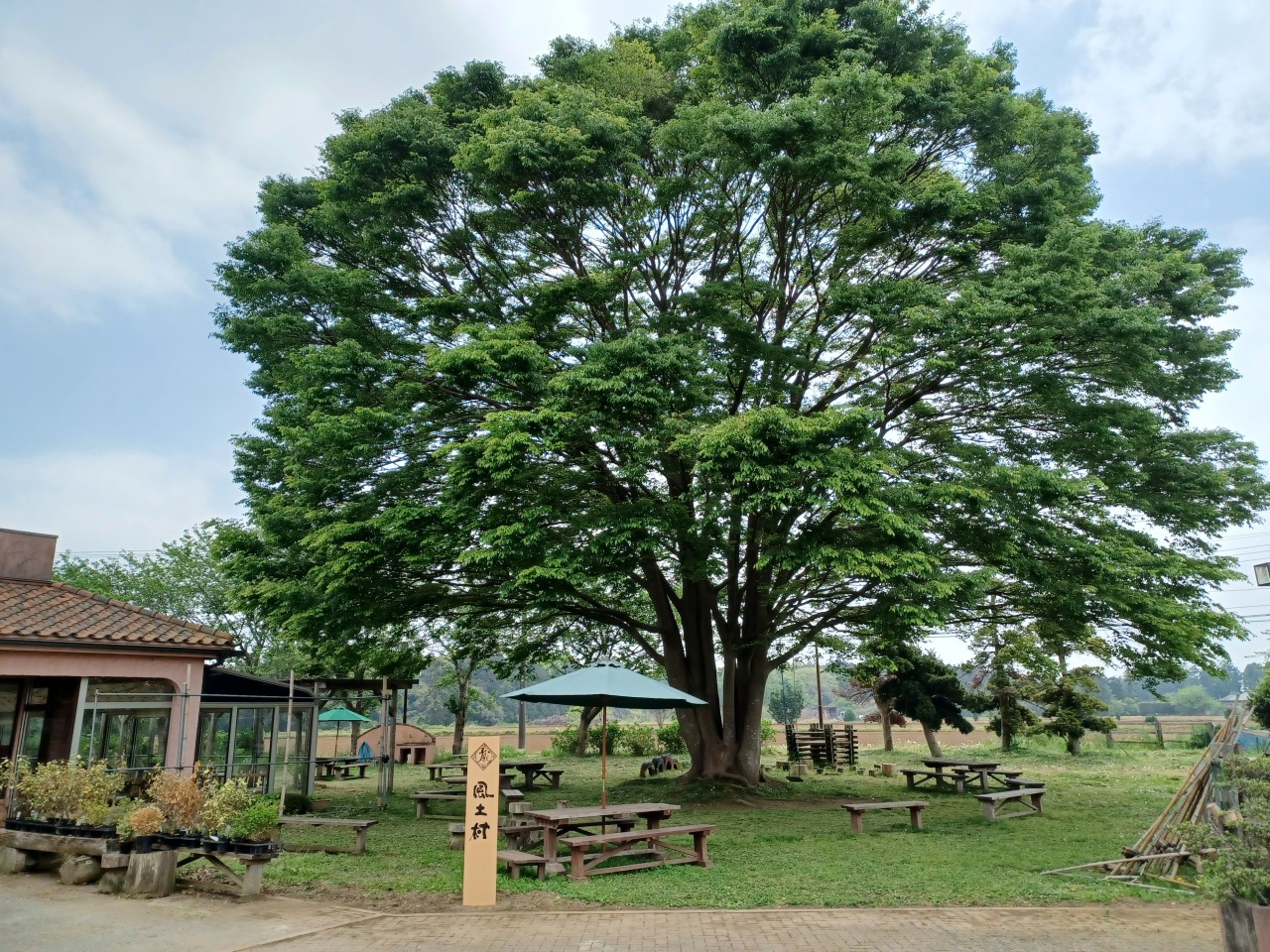 買い物後は「大きな欅の樹の下でカフェ」でひと休み。シンボルの大けやきを眺めながら庭のベンチでゆったりとした時間に浸れます。