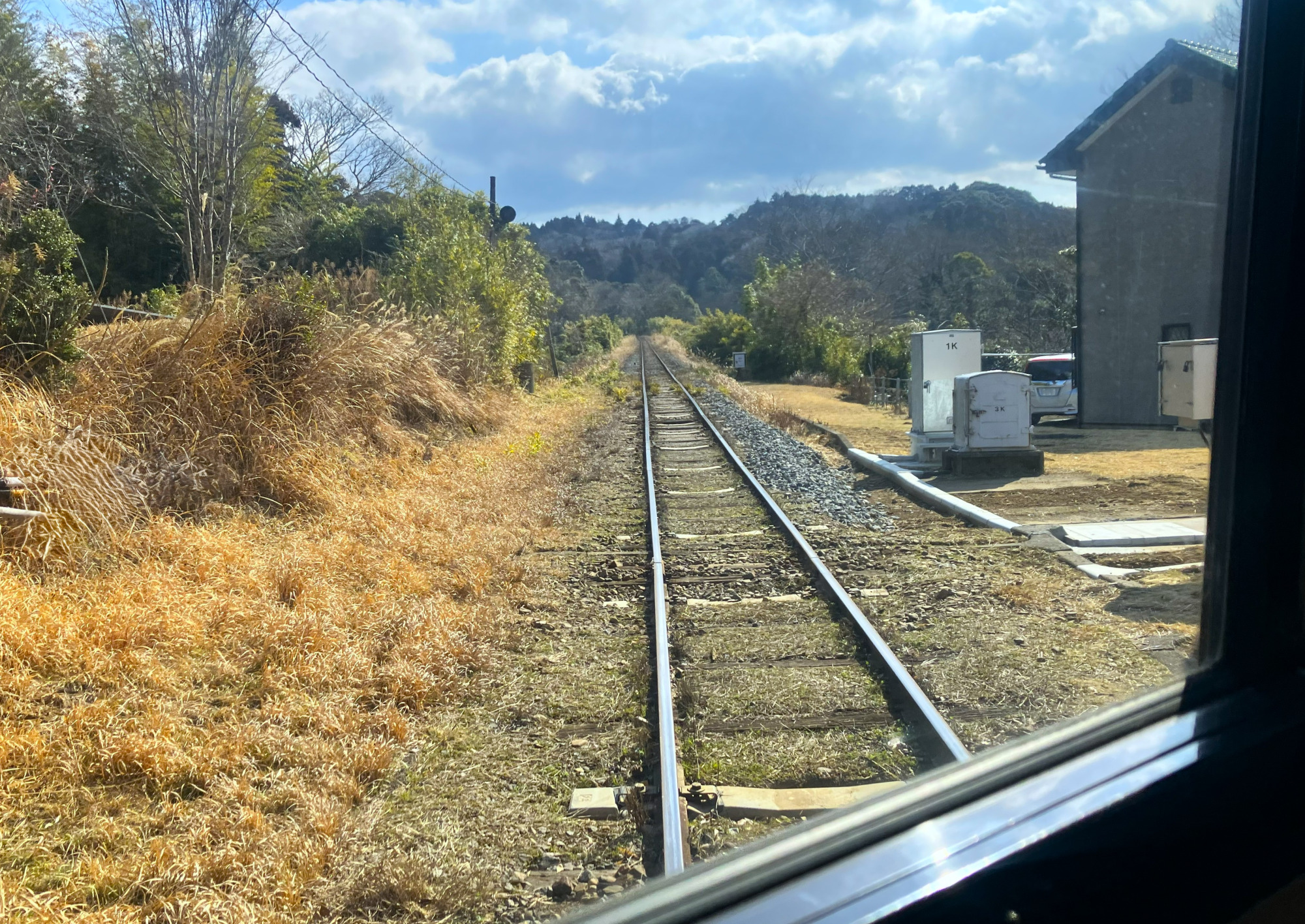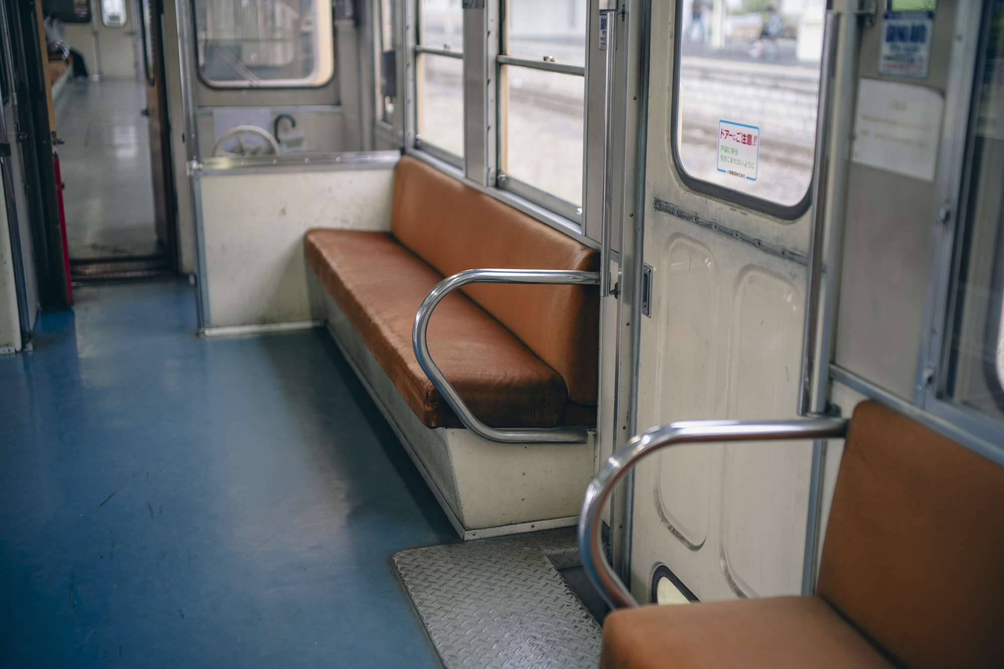 窓が大きめに作られているので、座席から外の景色を眺められます。途中で差し掛かる踏切と単線の線路など、車窓ごしに撮りたくなる風景に出会えるかもしれません。