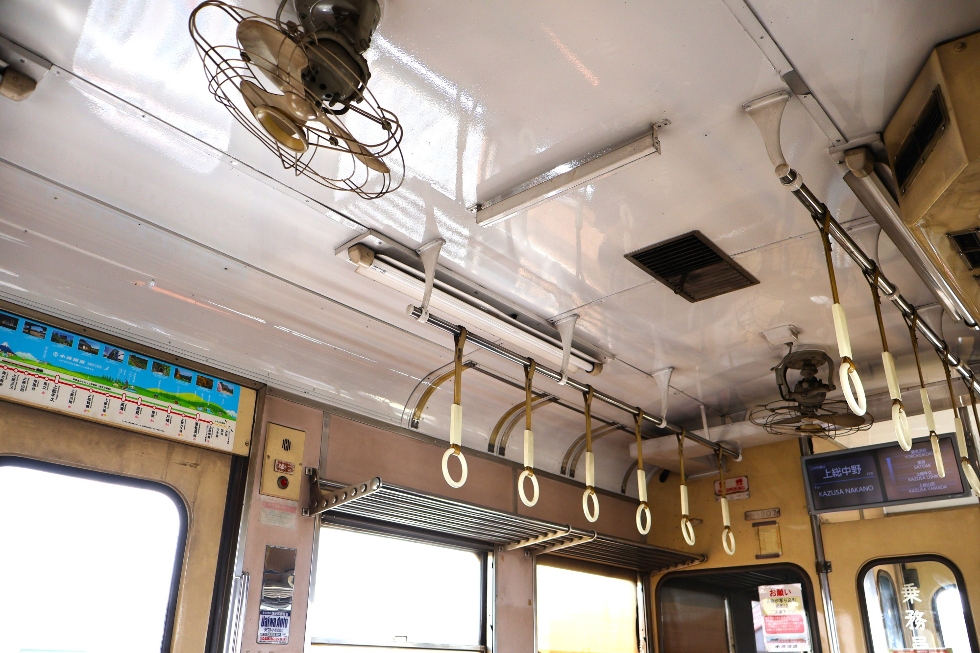 車両に乗り込むと、ディーゼル車独特の軽油の香りがほんのりと漂います。一般的な電車とは異なる細かい振動も小湊鐵道ならでは。昔懐かしいつり革や天井の扇風機にも昭和を感じられます。