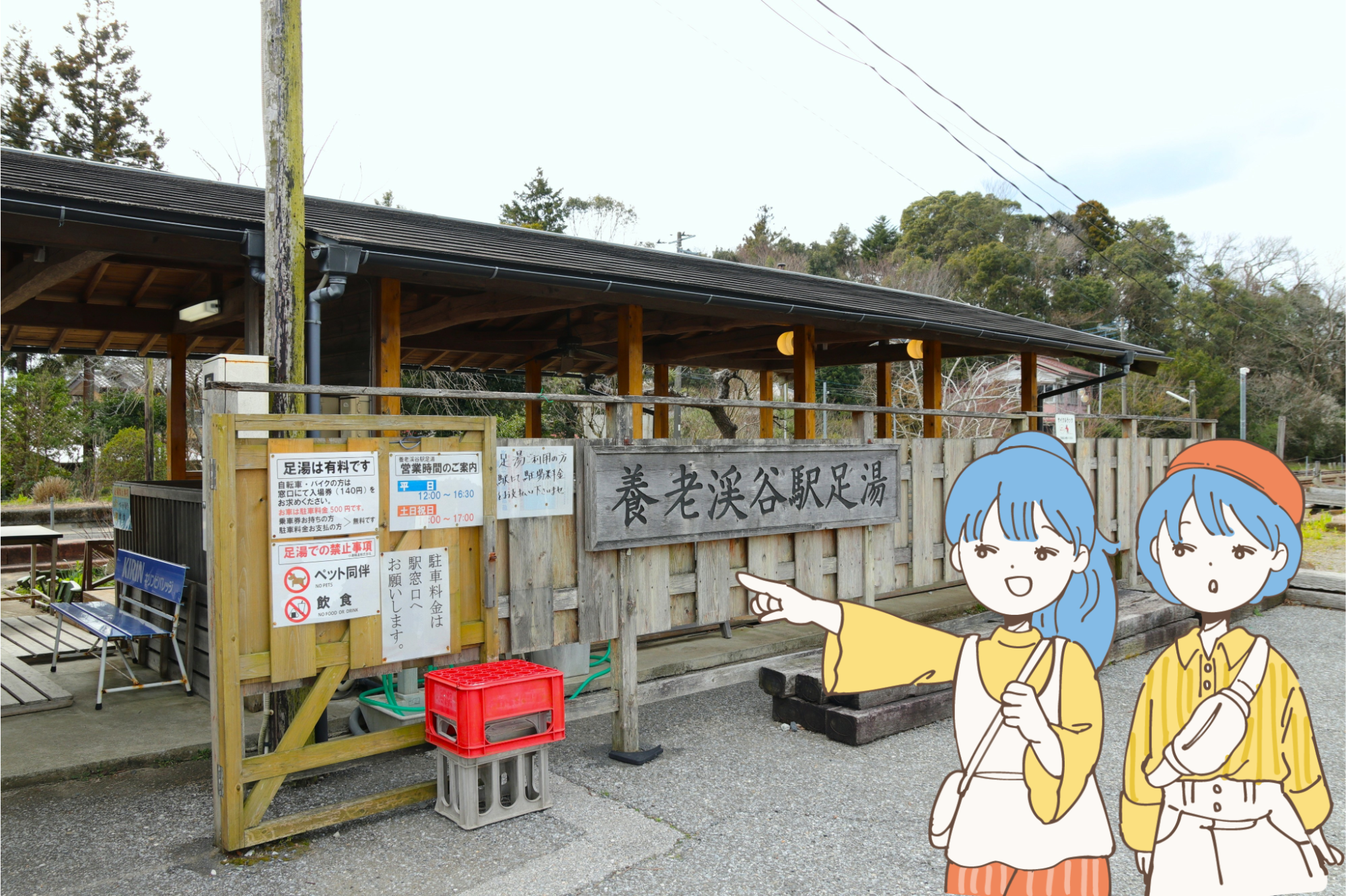 ここからは、養老渓谷駅から小湊バスに乗ってエリアの中心部へ。バスが来るまでの間、駅の脇にある足湯で温まりましょう。「駅で温泉を楽しむ」という珍しい体験ができます。