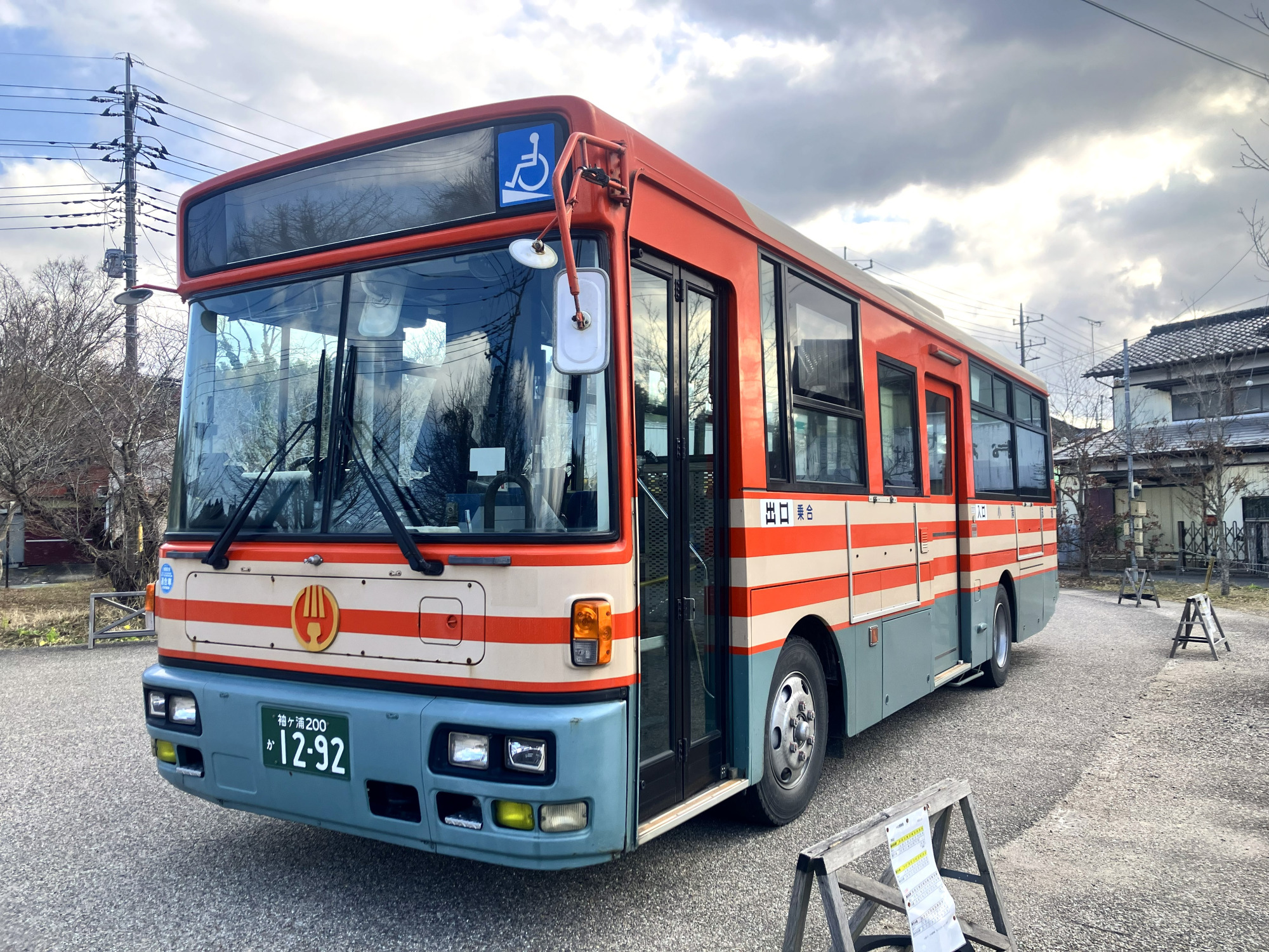 次の目的地までは、養老渓谷駅前からバスに乗って移動してみましょう。こちらもオレンジとベージュの優しいカラーが特徴のレトロな車両です。