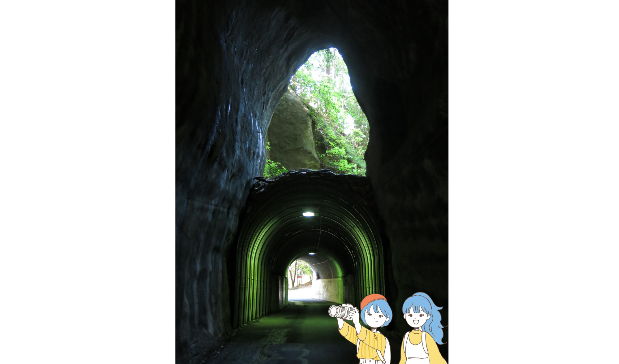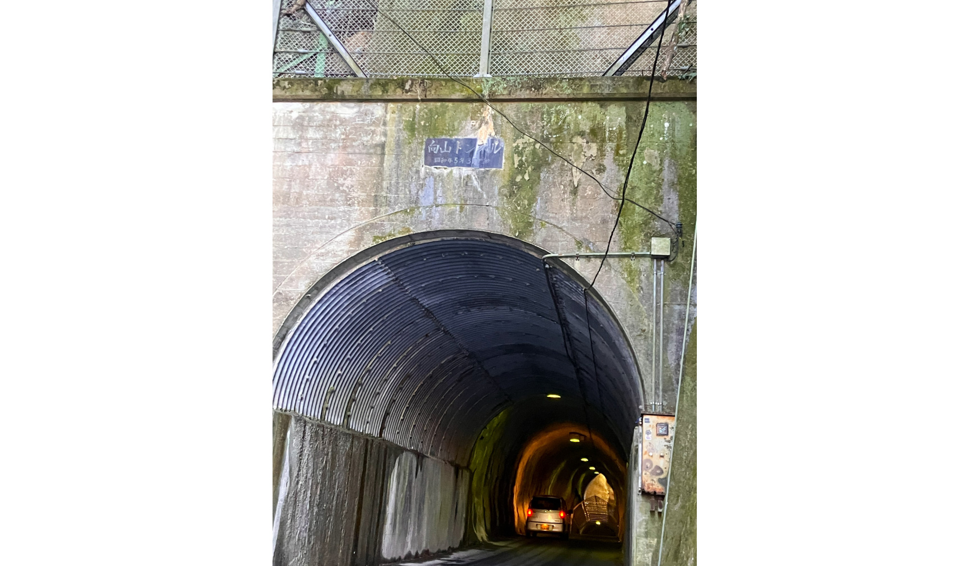 入っていくと、正面に窓のような穴が現れます。これはもともと使われていたトンネルの名残。接続する道路との関係でトンネルの途中から下の出口が新たに掘られましたが、元のトンネルを埋め戻さずに残したため2つの出口が上下に重なり、ひょうたんのようなシルエットの二階建てトンネルになったそうです。全長125mのうち、東側から91mが「向山トンネル」、西側から34mが「共栄トンネル」と別の名前が付けられているのもユニークです。