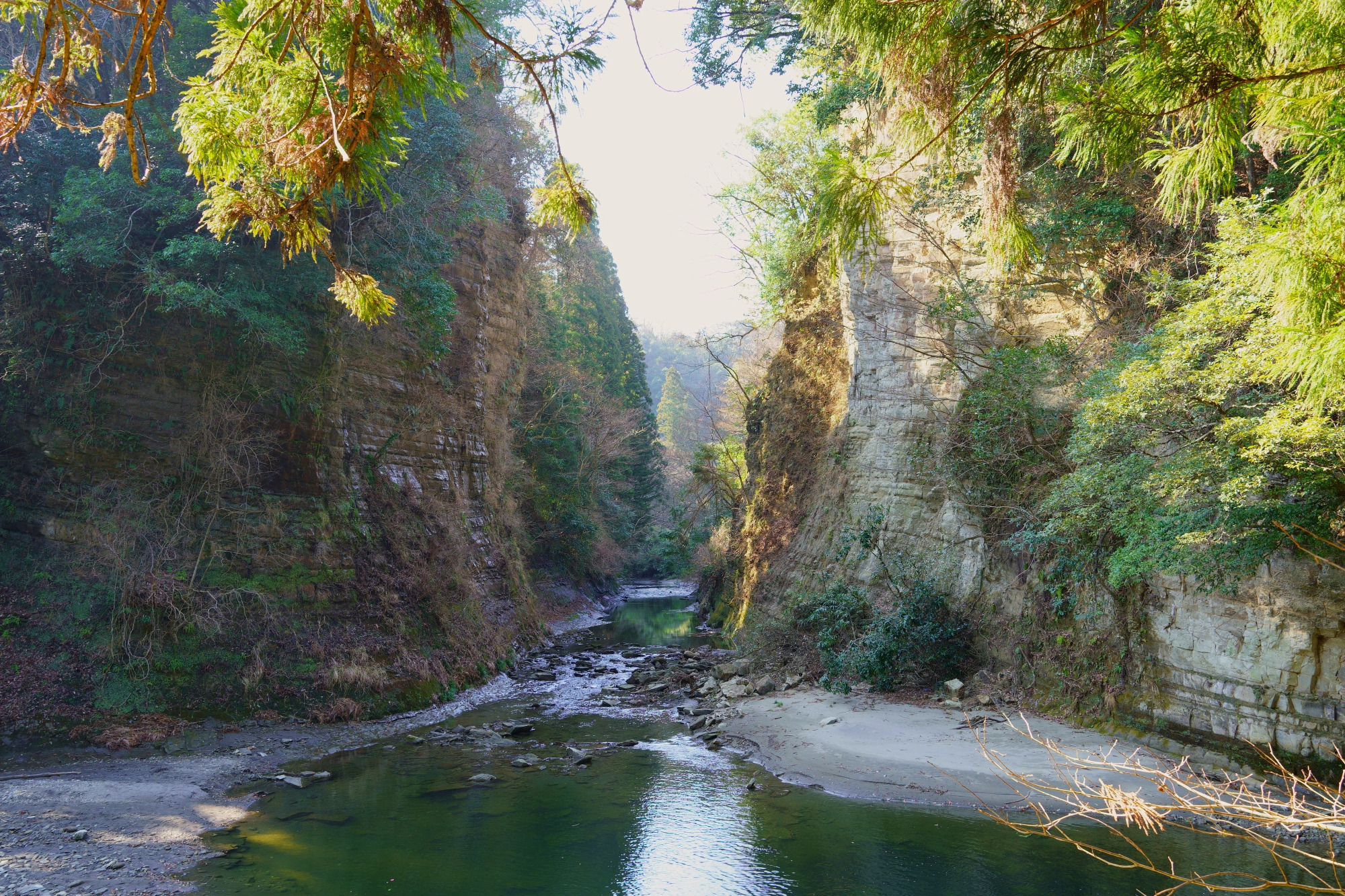 房総半島では古くから川の流れを人工的に短縮する「川廻し」と呼ばれる工事が行われてきました。養老渓谷エリアに滝や隧道(ずいどう)が多いのはこのため。砂と泥が交互に重なった地層のため風や水流によって岩肌が削られやすく、ユニークな景観を創り出しています。