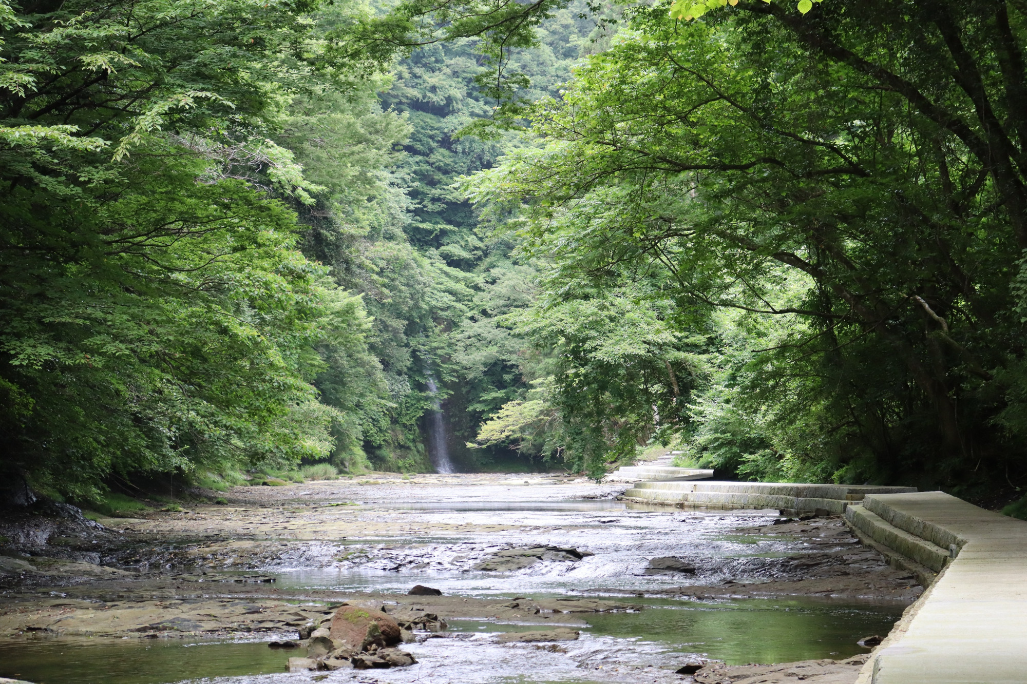 一般道から少し距離があるため、あたりは静まりかえっています。聞こえてくるのは清流のせせらぎと、野鳥のさえずりだけ。季節によって新緑や紅葉の美しい風景が視界いっぱいに広がります。