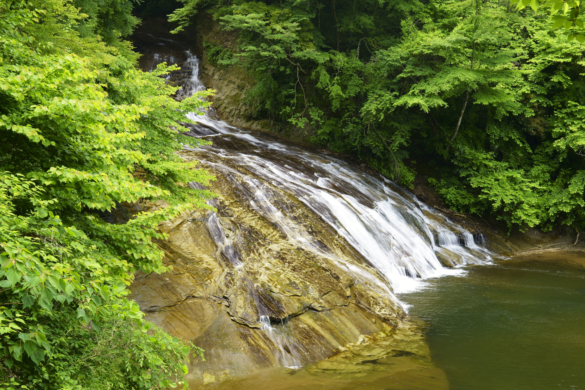 房総一の名瀑とも言われる「粟又の滝」は、写真好きなら一度は訪れたいフォトスポットです。約100mにわたって流れ落ちる、養老渓谷最大のスケールを誇る名瀑で、ゆるやかな階段状の岩肌を滑り降りるように流れています。