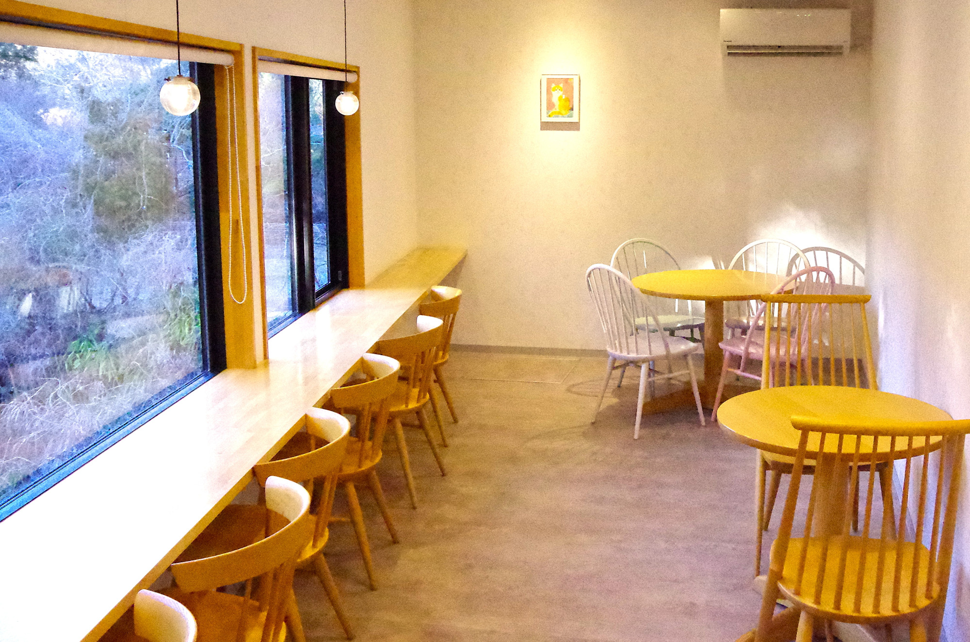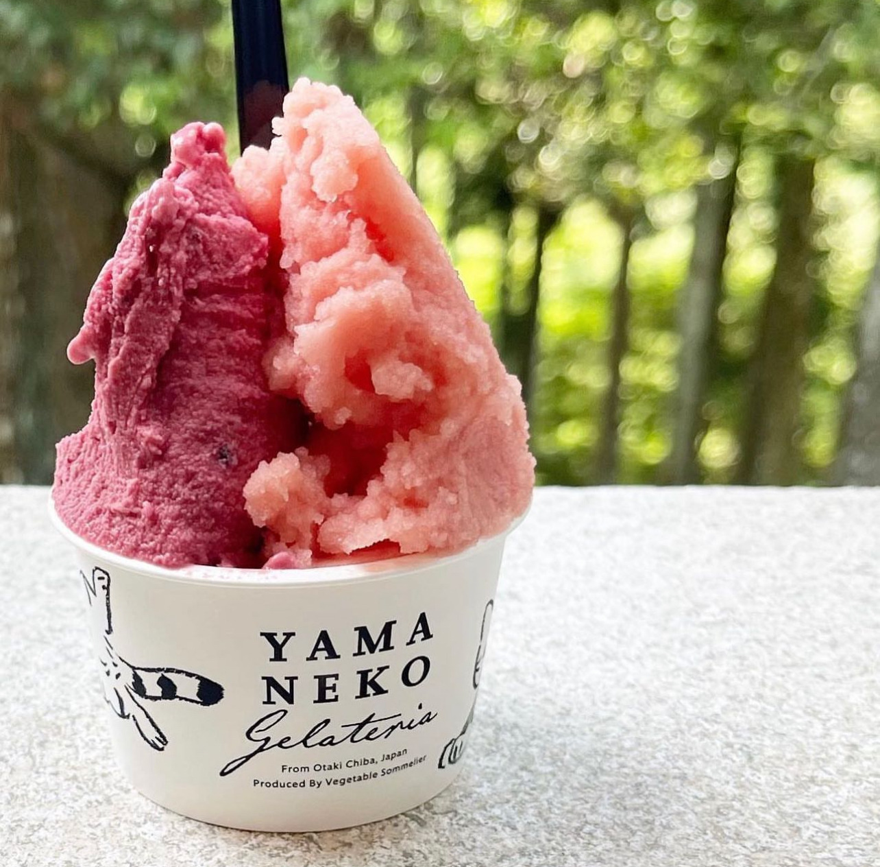 ジェラートはワイドな窓から景色を眺めながらいただくことができますが、一番のおすすめは、粟又の滝に面したテラス席。窓際にジェラートを置いたら、溶ける前に手早く撮りましょう。カップには店主の飼い猫をモデルにしたというイラストが描かれています。
