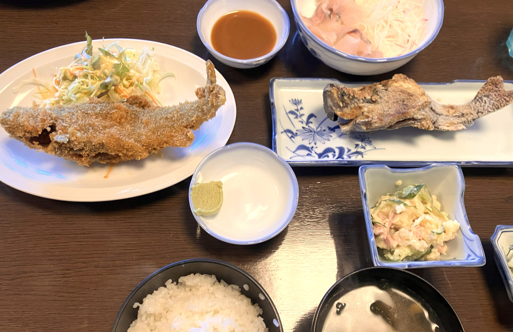 釣った魚は併設されている食事処でいただくことができます。定番の塩焼き、フライのほか、新鮮だからこそできるお刺身もおすすめです。