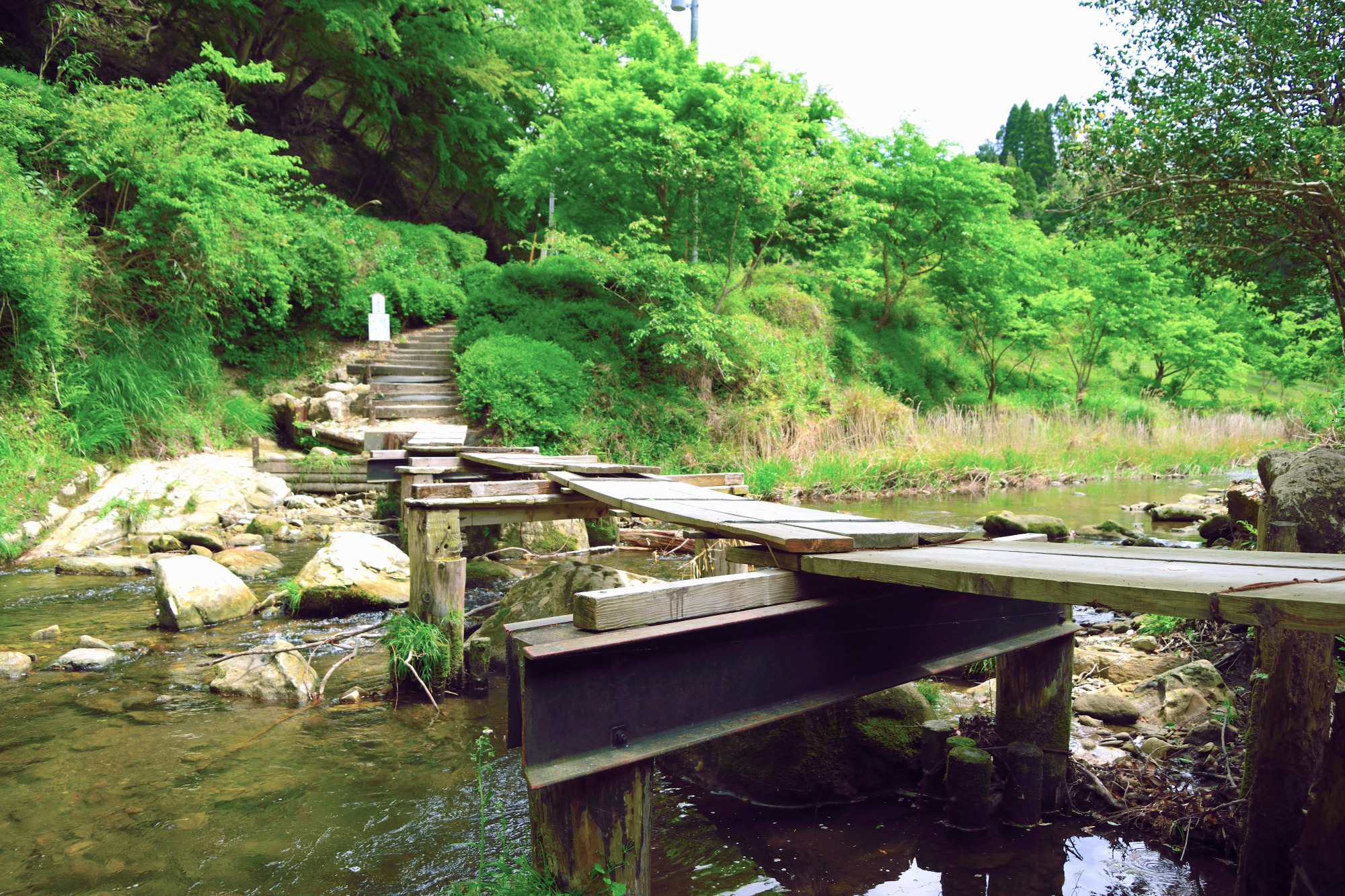 滝までの道のりは1周約1.5㎞のハイキングコースになっています。まずは温浴施設「ごりやくの湯」の駐車場から、裏手に流れる養老川へ降りていきます。向こう岸につながる「ぺたぺた橋」はベビーカーでは通行できません。人一人が通れるほどの幅なので、慌てず渡りましょう。
