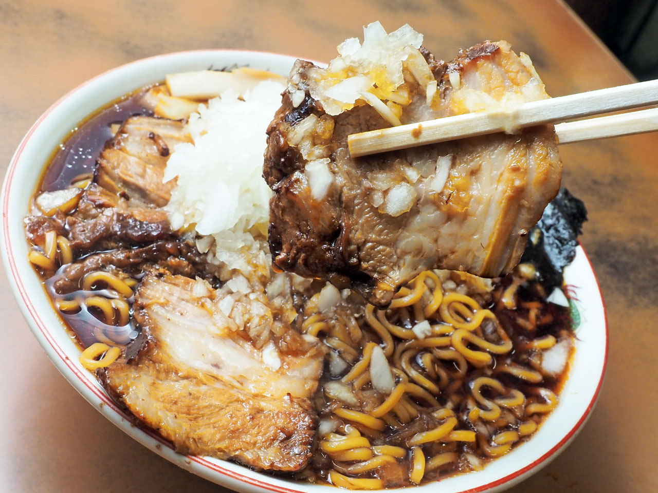 富津市竹岡で70年以上愛される、竹岡式ラーメンの名店「梅乃家」は、厚切りチャーシューと黒い醤油スープが特徴。チャーシューの煮汁を使ったスープはシンプルながらパンチがあり、刻みタマネギのトッピングがアクセントに。スープの濃さ調整も可能で、昭和レトロな店内も魅力です。