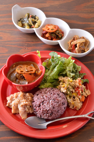15種類以上のスパイスや自家製の甘糀を使用した栄養満点の薬膳カレー、オーガニックポークを甘糀ソースで炒めたポークソテーなど、おいしくて身体にやさしい、世界各国のバラエティに富んだ料理を満喫できます。