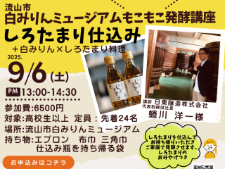※本講座は事前申込制(先着順)となります。流山市白みりんミュージアム公式InstagramへDM、もしくはメール(shiromirin@nagareyama-td.com)にてお申し込みください。