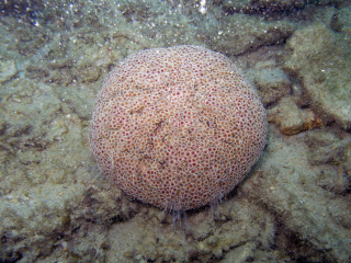 大型のウニで、殻は背の低い半球状です。短いトゲの間にラッパ状の叉棘が密生しており、それに触れると刺されます。水深の深いところに多いウ二ですが、潮間帯で見られることもあります。