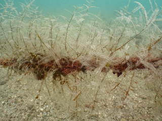 クラゲやイソギンチャクと同じ仲間です。刺激を受けると体表に備えられた有毒な刺胞が発射され人を刺します。羽のような部分が白色で、潮間帯では下部の岩の表面に生えています。